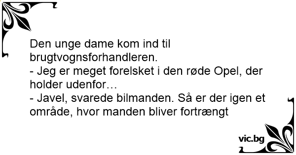 Den unge dame kom ind til brugtvognsforhandleren. - Jeg er meget forelsket i den røde Opel, der holder udenfor… - Javel, svarede bilmanden. Så er der igen et område, hvor manden bliver fortrængt