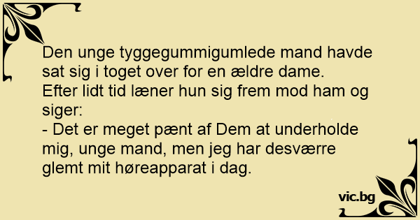 - Det er meget pænt af Dem at underholde mig, unge mand, men jeg har desværre glemt mit høreapparat i dag.