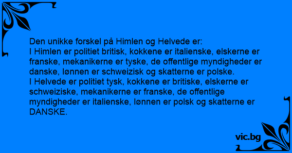 I Himlen er politiet britisk, kokkene er italienske, elskerne er franske, mekanikerne er tyske, de offentlige myndigheder er danske, lønnen er schweizisk og skatterne er polske.