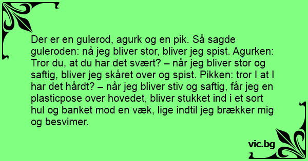 Der er en gulerod, agurk og en pik. Så sagde guleroden: nå jeg bliver stor, bliver jeg spist. Agurken: Tror du, at du har det svært? – når jeg bliver stor og saftig, bliver jeg skåret over og spist. Pikken: tror I at I har det hårdt? – når jeg bliver stiv og saftig, får jeg en plasticpose over hovedet, bliver stukket ind i et sort hul og banket mod en væk, lige indtil jeg brækker mig og besvimer.