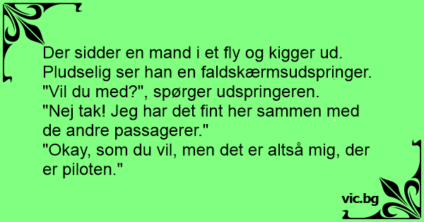 Der sidder en mand i et fly og kigger ud. Pludselig ser han en faldskærmsudspringer.