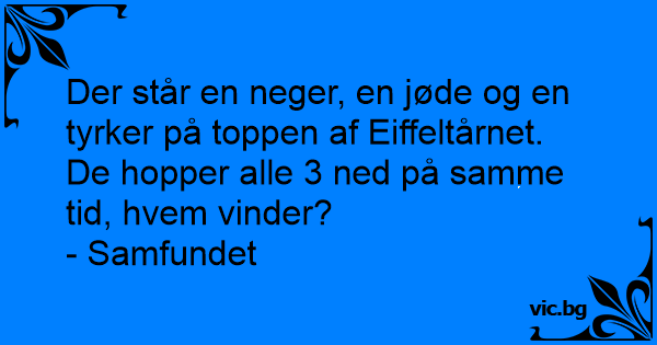 Der står en nеgеr, en jøde og en tyrker på toppen af Eiffeltårnet. De hopper alle 3 ned på samme tid, hvem vinder?