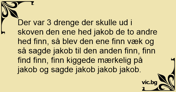 Der var 3 drenge der skulle ud i skoven den ene hed jakob de to andre hed finn, så blev den ene finn væk og så sagde jakob til den anden finn, finn find finn, finn kiggede mærkelig på jakob og sagde jakob jakob jakob.