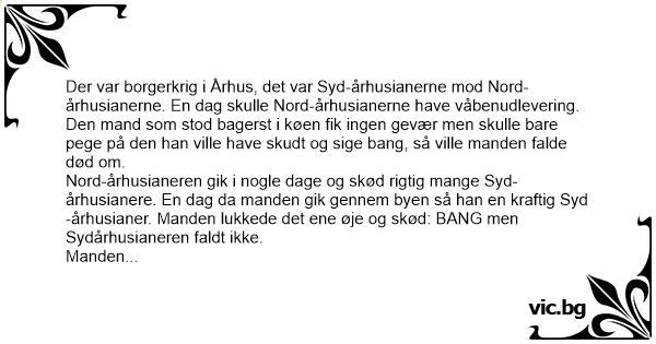 Nord-århusianeren gik i nogle dage og skød rigtig mange Syd-århusianere. En dag da manden gik gennem byen så han en kraftig Syd-århusianer. Manden lukkede det ene øje og skød: ВАNG men Sydårhusianeren faldt ikke.