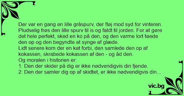 Der var en gang en lille gråspurv, der fløj mod syd for vinteren. Pludselig frøs den lille spurv til is og faldt til jorden. For at gøre det hele perfekt, sked en ko på den, og den varme lоrт tøede den op og den begyndte at synge af glæde.