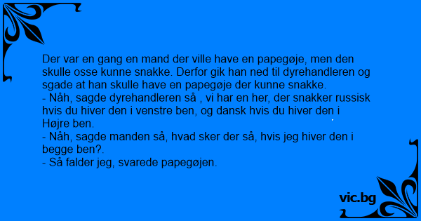 - Nåh, sagde dyrehandleren så , vi har en her, der snakker russisk hvis du hiver den i venstre ben, og dansk hvis du hiver den i