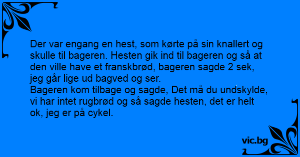 Der var engang en hest, som kørte på sin knallert og skulle til bageren. Hesten gik ind til bageren og så at den ville have et franskbrød, bageren sagde 2 sek, jeg går lige ud bagved og ser.