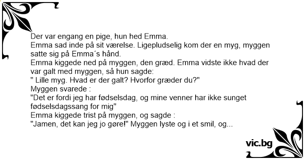 Emma kiggede ned på myggen, den græd. Emma vidste ikke hvad der var galt med myggen, så hun sagde: