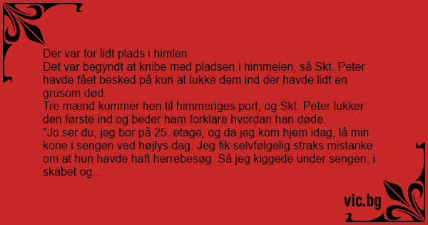 Det var en fæl omgang så han kommer også ind. Så bliver det den tredje og sidste mands tur, og Skt. Peter spørger, "nå hvordan døde du så?".