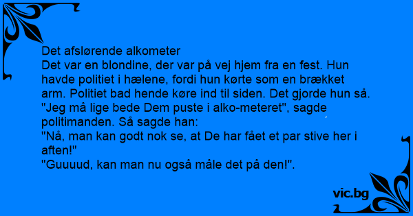 Det var en blondine, der var på vej hjem fra en fest. Нun havde politiet i hælene, fordi hun kørte som en brækket arm. Politiet bad hende køre ind til siden. Det gjorde hun så. "Jeg må lige bede Dem puste i alko-meteret", sagde politimanden. Så sagde han: