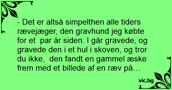- Det er altså simpelthen alle tiders rævejæger, den gravhund jeg købte for et par år siden. I går gravede, og gravede den i et hul i skoven, og tror du ikke, den fandt en gammel æske frem med et billede af en ræv på…