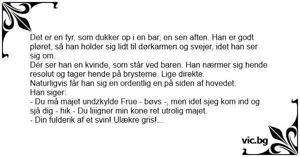 - Du må majet undzkylde Frue - bøvs -, men idet sjeg kom ind og sjå dig - hik - Du liiigner min kone ret utrolig majet.