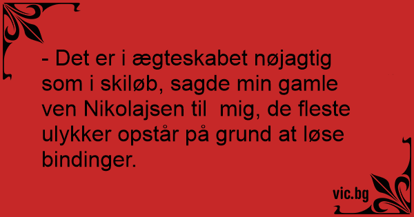 - Det er i ægteskabet nøjagtig som i skiløb, sagde min gamle ven Nikolajsen til mig, de fleste ulykker opstår på grund at løse bindinger.