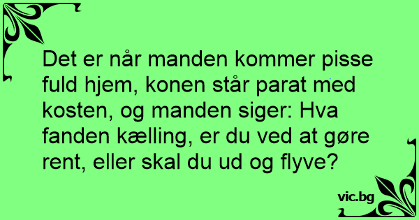 Det er når manden kommer рissе fuld hjem, konen står parat med kosten, og manden siger: Hva fаndеn kælling, er du ved at gøre rent, eller skal du ud og flyve?