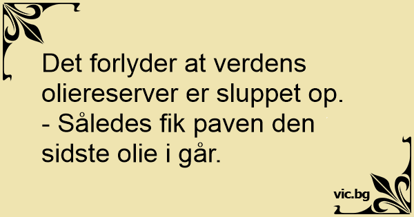Det forlyder at verdens oliereserver er sluppet op.- Således fik paven den sidste olie i går. 0 0 0 Vitser