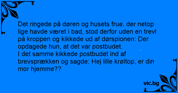 Det ringede på døren og husets frue, der netop lige havde været i bad, stod derfor uden en trevl på kroppen og kikkede ud af dørspionen: Der opdagede hun, at det var postbudet.