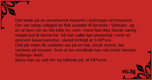 Ude på vejen fik soldaten øje på en høj, smuk nonne, der ventede på bussen. Som et lyn smuttede han ind under hendes fodlange skørt.