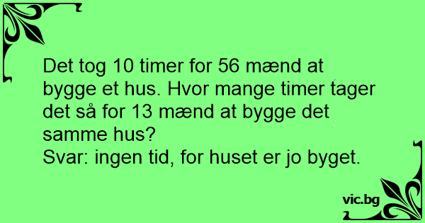 Det tog 10 timer for 56 mænd at bygge et hus. Hvor mange timer tager det så for 13 mænd at bygge det samme hus?