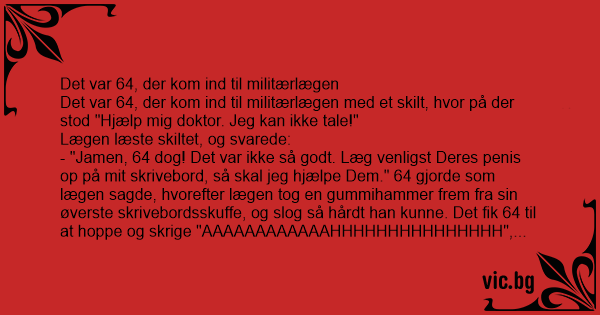 - "Jamen, 64 dog! Det var ikke så godt. Læg venligst Deres реnis op på mit skrivebord, så skal jeg hjælpe Dem." 64 gjorde som lægen sagde, hvorefter lægen tog en gummihammer frem fra sin øverste skrivebordsskuffe, og slog så hårdt han kunne. Det fik 64 til at hoppe og skrige "AAAAAAAAAAAAHHHHHHHHHHHHHHH", hvortil lægen svarede: