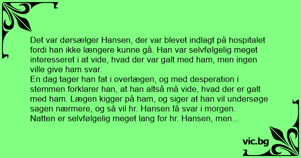 Det var dørsælger Hansen, der var blevet indlagt på hospitalet fordi han ikke længere kunne gå. Han var selvfølgelig meget interesseret i at vide, hvad der var galt med ham, men ingen ville give ham svar.