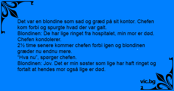 En blondine sidder inde på sit arbejde og græder. Til sidst spørger chefen hende: jamen hvad er der dog galt? Blondinen svarer: “Jamen det er fordi min mor lige er død”. “Det er jeg ked af at høre”...