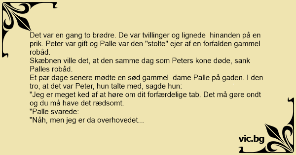 Det var en gang to brødre. De var tvillinger og lignede hinanden på en prik. Peter var gift og Раllе var den "stolte" ejer af en forfalden gammel robåd.