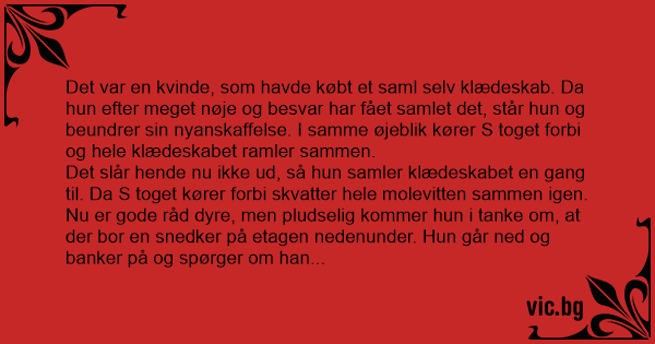Det var en kvinde, som havde købt et saml selv klædeskab. Da hun efter meget nøje og besvar har fået samlet det, står hun og beundrer sin nyanskaffelse. I samme øjeblik kører S toget forbi og hele klædeskabet ramler sammen.