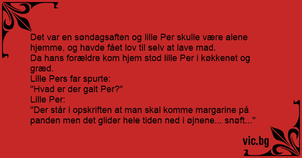 Det var en søndagsaften og lille Per skulle være alene hjemme, og havde fået lov til selv at lave mad.