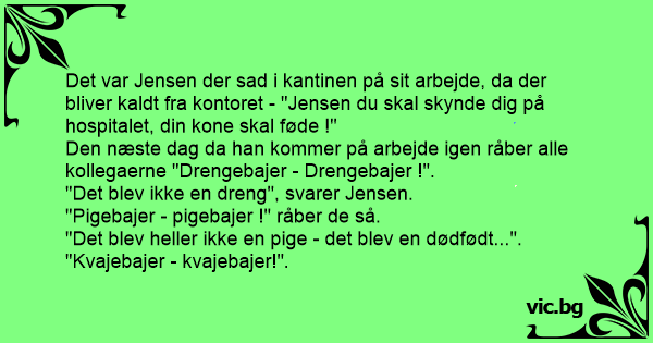 Det var Jensen der sad i kantinen på sit arbejde, da der bliver kaldt fra kontoret - "Jensen du skal skynde dig på hospitalet, din kone skal føde !"