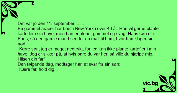 En gammel araber har boet i New York i over 40 år. Han vil gerne plante kartofler i sin have, men han er alene, gammel og svag. Hans søn er i Paris, så den gamle mand sender en mail til ham, hvor han klager sin nød: