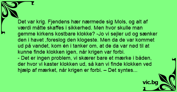 Det var krig. Fjendens hær nærmede sig Mols, og alt af værdi måtte skaffes i sikkerhed. Men hvor skulle man gemme kirkens kostbare klokke? -Jo vi sejler ud og sænker den i havet ,foreslog den klogeste. Men da de var kommet ud på vandet, kom én i tanker om, at de da var nød til at kunne finde klokken igen, når krigen var forbi.