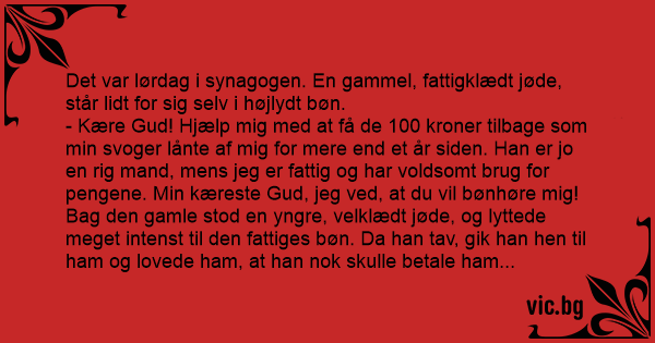 - Kære Gud! Hjælp mig med at få de 100 kroner tilbage som min svoger lånte af mig for mere end et år siden. Han er jo en rig mand, mens jeg er fattig og har voldsomt brug for pengene. Min kæreste Gud, jeg ved, at du vil bønhøre mig!