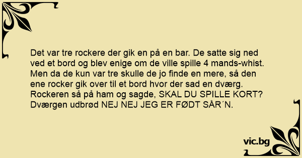 Rockeren så på ham og sagde, SKAL DU SPILLE KORT? Dværgen udbrød NEJ NEJ JEG ER FØDT SÅR´N.
