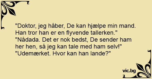 "Doktor, jeg håber, De kan hjælpe min mand. Han tror han er en flyvende tallerken."