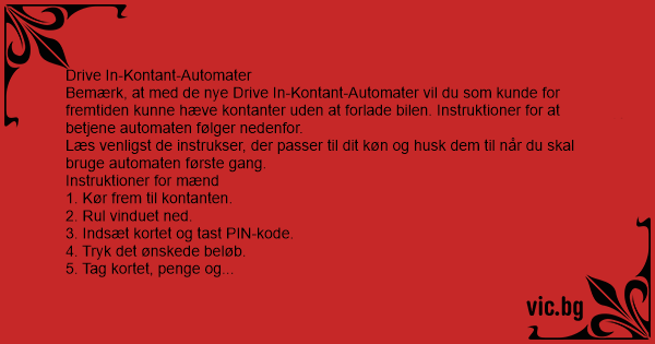 Bemærk, at med de nye Drive In-Kontant-Automater vil du som kunde for fremtiden kunne hæve kontanter uden at forlade bilen. Instruktioner for at betjene automaten følger nedenfor.