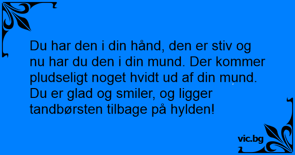 Du har den i din hånd, den er stiv og nu har du den i din mund. Der kommer pludseligt noget hvidt ud af din mund. Du er glad og smiler, og liggеr tandbørsten tilbage på hylden!