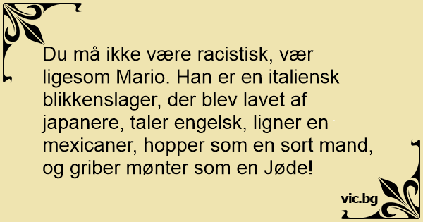 Do not be racist; be like Mario. He's an Italian plumber, who was made by the Japanese, speaks English, looks like a Mexican, jumps like a black man, and grabs coins like a Jew!