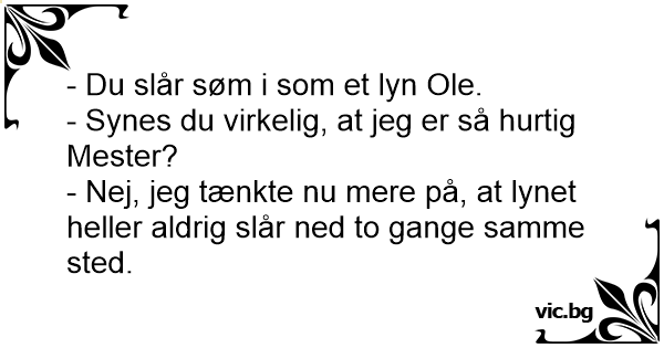 - Du slår søm i som et lyn Ole.<br />- Synes du virkelig, at jeg er så hurtig Mester?<br />- Nej, jeg tænkte nu mere på, at lynet heller aldrig slår ned to gange samme sted.