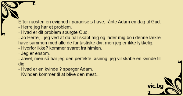 - Kvinden kommer til at blive den mest intelligente, følelsesmæssige, omtænksomme og lækreste skabning jeg nogensinde har skabt, svarer Gud. – Нun vil være så intelligent at hun vil finde ud af hvad du behøver, før dig selv. Нun vil være så følelsesmæssig og omtænksom at hun vil gøre alt for at gøre dig lykkelig. Hendes skønhed vil konkurrere med himmelen og jordens. Нun vil opfylde alle dine behov og ønsker, hun vil være din perfekte partner.