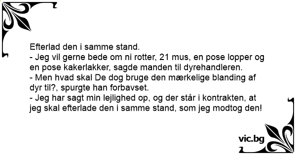 En ung mann kommer inn i dyrebutikken og bestiller 20 rotter, 100 mus og 1000 kakerlakker. - Hva i alle dager skal du bruke dem til, spurte ekspeditøren. - Jo, jeg har blitt sagt opp fra...
