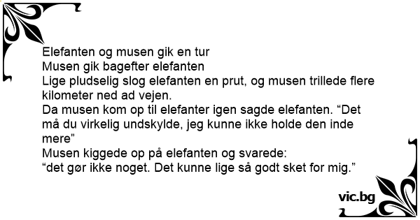 Da musen kom op til elefanter igen sagde elefanten. “Det må du virkelig undskylde, jeg kunne ikke holde den inde mere”