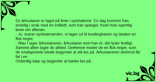 En århusianer er taget på ferie i sydstaterne. En dag kommer han endelig i snak med en indfødt, som han spørger, hvad man egentlig laver om aftenen.