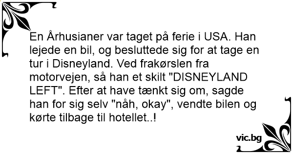 En Århusianer var taget på ferie i USA. Han lejede en bil, og besluttede sig for at tage en tur i Disneyland. Ved frakørslen fra motorvejen, så han et skilt "DISNEYLAND LEFT". Efter at have tænkt sig om, sagde han for sig selv "nåh, okay", vendte bilen og kørte tilbage til hotellet..!