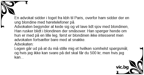 Blondinen og advokaten Blondine og en advokat sidder ved siden af hinanden i et fly fra Los Angeles til New York. Advokaten spørger, om blondinen vil lege en sjov leg med ham. Blondinen, der er...