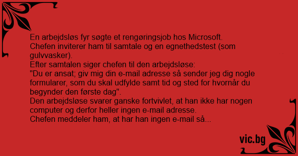 Egy munkanélküli jelentkezett a Microsofthoz, takarítói állásra. A HR-es behívta, elbeszélgetett vele, és tesztelte: söpörje fel a padlót, és utána azt mondta: - Ok, felveszlek, add meg az e-mail...