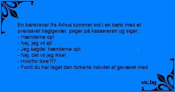 En bankrøver fra Århus kommer ind i en bank med et oversavet haglgevær, peger på kassereren og siger: