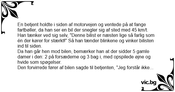 "Frue," svarer betjenten, "De kørte ikke for stærkt, men De bør vide at det også kan være farligt for andre bilister når De kører for langsomt."