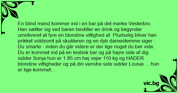 Du smarte - inden du går videre er der lige noget du bør vide. Du er kommet ind på en lesbisk bar og på højre side af dig sidder Sonja hun er 1.85 cm høj vejer 110 kg og HADER blondine vittigheder og på din venstre side sidder Lousie ... hun er lige kommet ud af fængslet efter at have slået sin bror ihjel fordi han blev ved med at fyre blondine vittigheder. Sidst men ikke mindst så HADER jeg selv blondine vittigheder og JEG har et meget heftigt temperament.. Såå er du helt sikker på du ønsker at fortsætte ????.