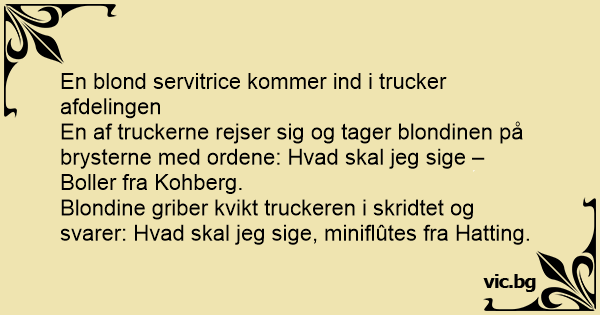 En af truckerne rejser sig og tager blondinen på brysterne med ordene: Hvad skal jeg sige – Boller fra Kohberg.