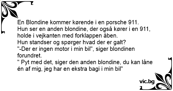 " Pyt med det, siger den anden blondine, du kan låne én af mig, jeg har en ekstra bagi i min bil"